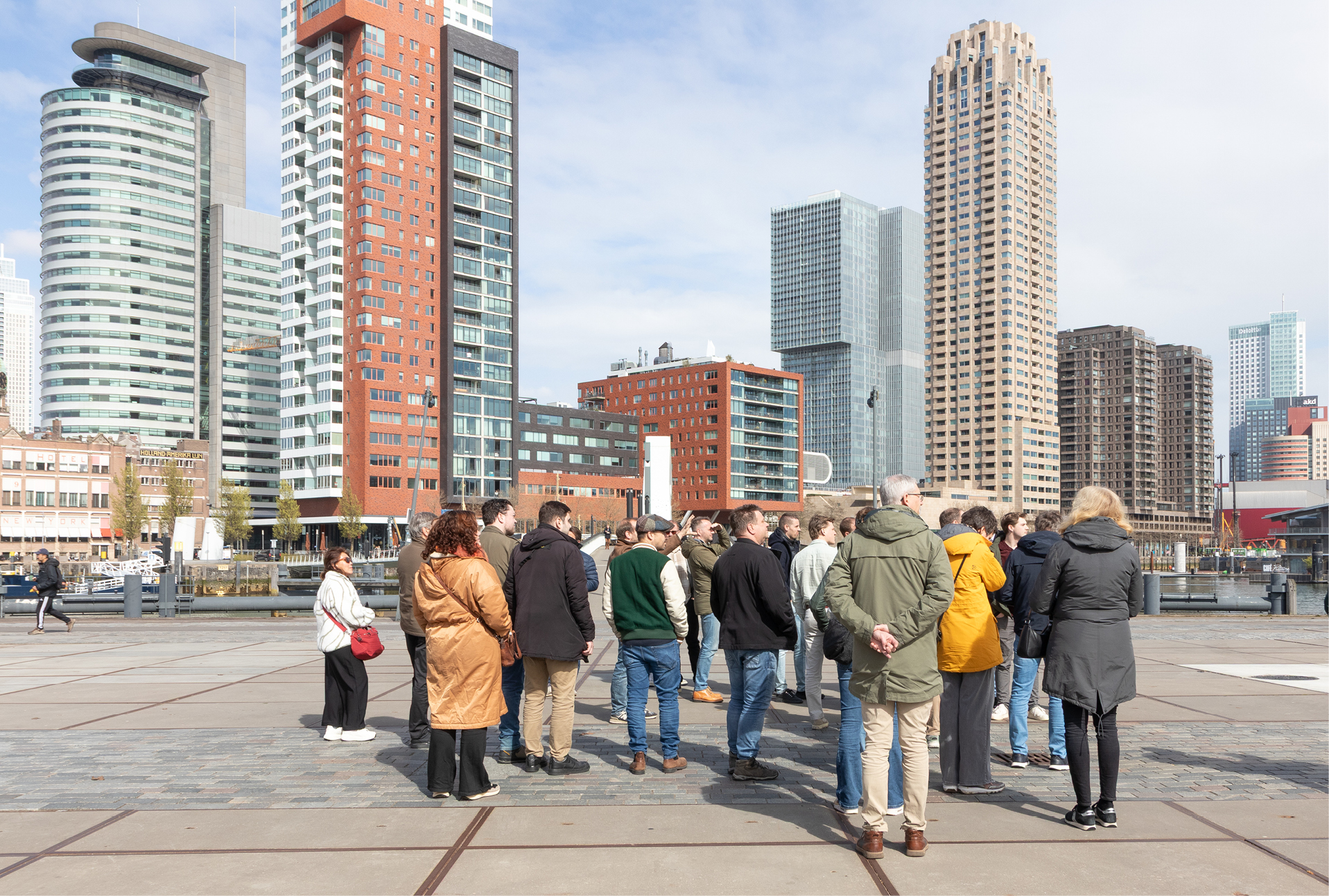 Deze bijzondere dag hebben we samen met collega’s en een aantal oud-collega’s in Rotterdam doorgebracht. De architectuurwandeling startte op het Deliplein en liep via de Kop van Zuid door het Scheepvaartkwartier, langs Little C en SAWA en eindigde met een rondleiding in het Depot. Daar sloten we de dag af met uitzicht over de stad en een heerlijk diner. Tijdens deze dag werd Wim verrast met diverse cadeaus, waaronder een fotoboek vol projecten en herinneringen aan reizen en uitjes, een zelfportret en een grijswaaier met persoonlijke woorden van collega’s.
